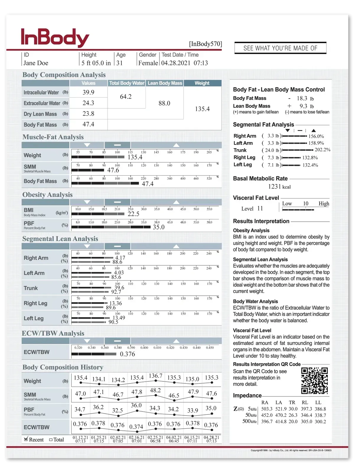 An InBody scan shows the big picture of what your body is made up of. You will be able to see the details of what your are made up of and recommendations of what do to improve your health.